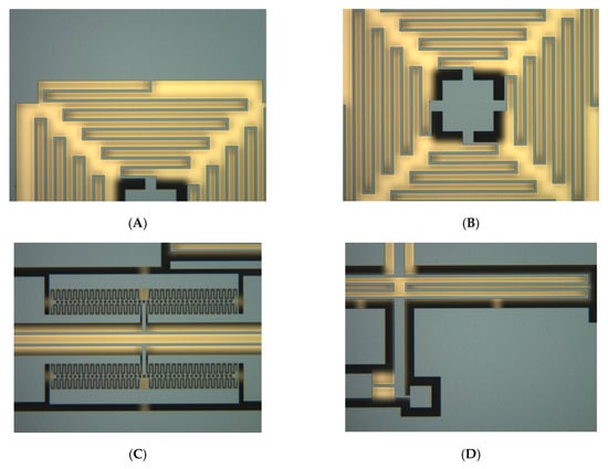 The optical photographs of the fabricated prototype. (A) Swing suppression structure. (B) The center of the swing suppression structure. (C) The double-ended tuning fork resonator. (D) The lever elastic beam.