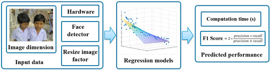 In this work, we built regression models to predict the face detection performance (computational time and F1 score) using five explanatory variables: the input image size (width and height), the image resized percentage (, , and of the original image size), the face detector (MTCNN, PyramidBox, DSFD), and the hardware (specific CPU or GPU). We collected the face detection performance information considering the image data sets, detectors, resizing strategy, and hardware described above.
