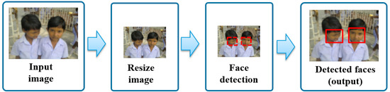 In Figure 2 we illustrate the data flow of the resizing strategy that we evaluate. We use it to substantially decrease processing time for face detection in [34]. First, the largest dimension of the image—height or width—is used as reference to reduce the image resolution in a percentage of their original size using bilinear interpolation. This allows us to keep the aspect ratio proportional of the image content including faces. Secondly, bounding boxes corresponding to the face locations are detected on resized images using a deep-learning based method. Finally, detected bounding boxes containing face locations are scaled back to the original image dimensions and returned as output. This step is necessary due to the fact that detected faces would be used in applications where face locations are expected in original image coordinates, such as face recognition, age and gender estimation.