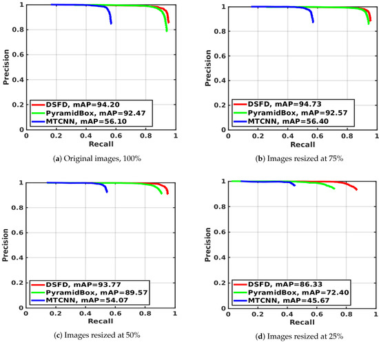 Table 5 shows the mAP, the F1 score and the face detection speed (in seconds) computed for the evaluated hardware and image sizes. Table 6 presents the of the mAP, the F1 score and the processing time by comparing the detectors’ performance with three relative sizes—, and —against the results with original images. Figure 3 presents the precision–recall curves for the evaluated detectors, and Figure 4 exhibits the average computation time on CPUs and GPUs. In both cases, results are grouped by the evaluated image sizes.