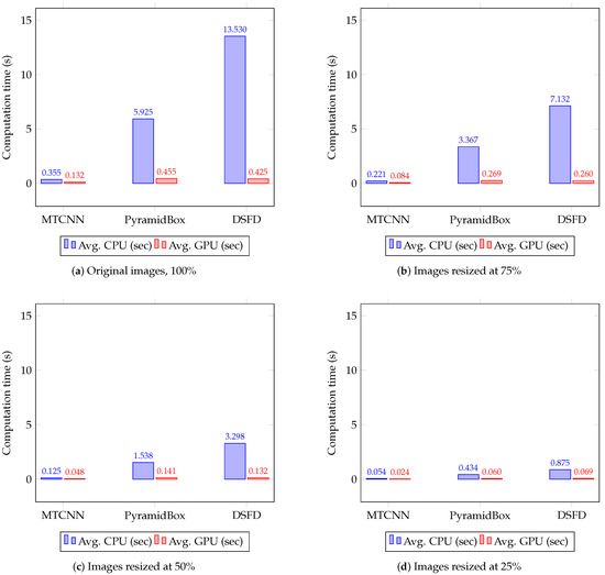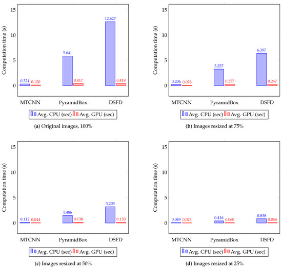 Furthermore, the use of resized images improves detection speed in comparison with the analysis of full size images (see Table 6). A large resized image percentage leads to a significant processing time decrease. Therefore, the maximum speed-up, in both CPUs and GPUs, is observed with images resized to of the original size. In this case, the fastest face detection is achieved using GPUs with an average (Avg.) in speed of for MTCNN, for PyramidBox and for DSFD. Although face detection is performed faster in GPUs, the use of resized images allow a larger speed-up during CPU analysis with an Avg. in detection times of for MTCNN, for PyramidBox and for DSFD.