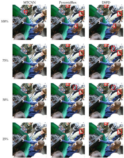 Figure 5 illustrates the face detection results on images with subjects in a side-view position (difficult pose). In these conditions, MTCNN does not detect any face from the original or resized images. While the most robust face detectors—DSFD and PyramidBox—detect faces in all the evaluated cases. The precise localization of the bounding boxes around the detected faces are affected by the dimensions of the concerned image.