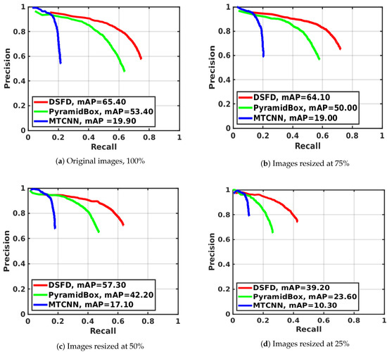Table 7 shows the mAP values, the F1 scores and the speed obtained for the evaluated face detectors using the considered image sizes, CPUs and GPUs. Figure 6 depicts the precision–recall curves of detectors, and Figure 7 presents the average processing time on CPUs and GPUs. In both figures, results are summarized by the analysed image resolutions. Table 8 reports the of the mAP, the F1 score and the speed of the face detectors with different image resolutions against the results using full size images.