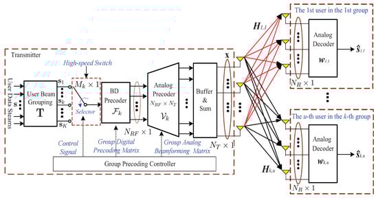 In our proposed group-by-group BD digital precoding system shown in Figure 1, the users are first divided into K groups with the group size being , where for . It is clear that . Accordingly, the data-streams can be rewritten in groups as: