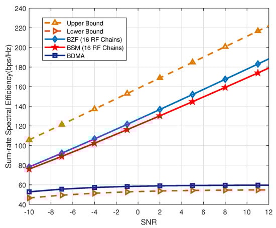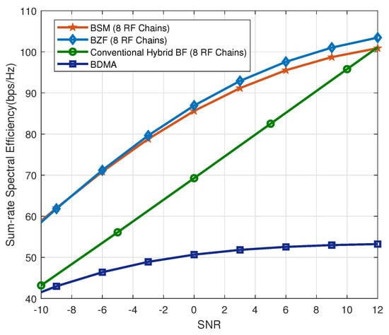 Next, we evaluate the two proposed BD precoding schemes with groups and 8 RF chains. The 16 users are grouped into groups. The curves labeled as “BZF” and “BSM” stands for the proposed BD precoding schemes where only 8 RF chains are used to transmit 16 data-streams. It is observed that BZF and BSM have comparable performance. Furthermore, the curve labeled as “Conventional Hybrid BF (8 RF Chains)” is the sum-rate for the conventional hybrid beamforming system with 8 RF chains serving 8 users. Finally, BDMA is the analog-only precoding system that has the worst performance. Inspection of Figure 3 reveals that the proposed BZF and BSM have much better sum-rate performance than the conventional hybrid precoding algorithm over the SNR range dB. When the SNR is larger than 12 dB, the system becomes interference-limited. Thus, the performance of BZF and BSM tends to saturate beyond this point.