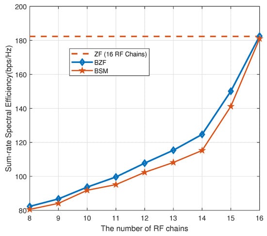 In Figure 4, we investigate the sum-rate capacity improvement as a function of the number of RF chains while fixing the SNR at 5 dB. The upper bound is the conventional ZF precoding system with 16 RF chains for 16 users. Interestingly, the performance improvement generated by an additional RF chain increases only marginally as the number of RF chains grows from eight to 14.