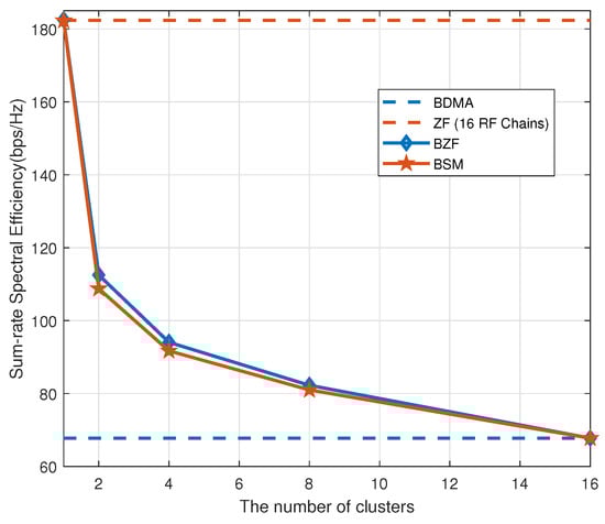 Next, we vary the number of groups while fixing the total number of users at and SNR dB. Figure 5 shows that BZF and BSM are lower bounded by BDMA and upper bounded by the conventional ZF system with 16 RF chains. When , the system degenerates back to the conventional ZF system with . On the other hand, if , the system becomes the conventional BDMA.