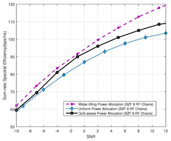 Meanwhile, power allocation is also an important problem in co-channel interference management for multi-user wireless networks. In many MIMO applications, it is desirable to design a system satisfying the quality of service (QoS) constraint for each user by adjusting the power allocated to different users [20]. Since the objective function is highly non-convex, the problem is usually very difficult and complicated, especially for the coupled analog and digital precoding constraints [21]. Therefore, most existing works maximize the sum-rate capacity by implementing the water-filling algorithm without considering the QoS requirement for each user. For instance, [22] alternatively optimized the power allocation for sum-rate maximization by using the water-filling algorithm, assuming that the analog precoders are strictly orthogonal among distinct users. However, the water-filling algorithm cannot satisfy the per-user QoS constraint as users with poor channel conditions are not allocated any transmit power by the water-filling algorithm. To cope with this problem, the signal-to-interference-and-noise ratio (SINR)-balanced power allocation has been proposed to achieve identical SINR for all users [23,24,25,26]. However, the system performance using the SINR-based power allocation is limited by the user with the worst channel conditions.