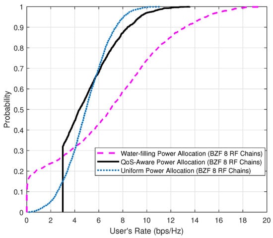 Finally, we evaluate the performance of the power allocation generated with the D.C. programming technique. We assume that the minimum QoS threshold for each user is set to 3 bps/Hz. Figure 7 and Figure 8 show the performance achieved by our proposed QoS-aware power allocation algorithm. The curve labeled as “Water-filling Power Allocation” is obtained by allocating user power via the water-filling algorithm without taking into account the QoS requirement. The curve labeled as “QoS-Aware Power Allocation” shows the performance of the proposed power allocation algorithm. Compared to the curve labeled as “Uniform Power Allocation”, the proposed algorithm has demonstrated significant advantages in terms of the sum-rate capacity. Furthermore, Figure 8 depicts the CDF of the user data rate. It is evident that all users served by the QoS-aware power allocation satisfy the minimum QoS requirement (i.e., 3 bps/Hz). In contrast, the water-filling-based power algorithm suffers from an outage rate of about 20% where outage is defined as the user data rate being below the minimum required data rate.