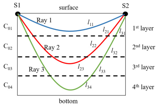 where lij represents ith (i = 1, 2, 3) ray across jth (j = 1, 2, 3, 4) layer. C0j and δCj are the reference sound speed and its deviation of jth layer, respectively. t0i and δti are the reference travel time and travel time deviation of ith ray, respectively.