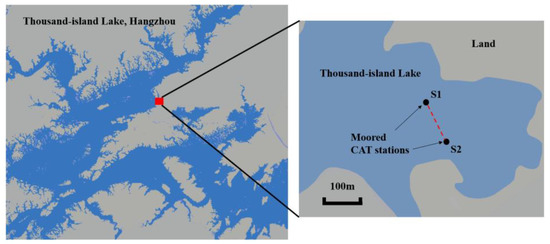 The experiment is carried out in Thousand-Island Lake, Hangzhou, China on 12 November 2019, and experiment site is as shows in the Figure 2. Thousand-Island Lake has a distinct temperature stratification along the vertical slice with nearly no current, which is suitable for temperature measuring experiments. The experimental settings are displayed in Figure 3. Two stations with a distance of about 140 m are arranged in the lake to transmit and receive acoustic signals. The transducers are laid in the depth of 10 m from two fishing boats. The bottom of the experiment site has a thick sedimentary layer, which increases energy attenuation when sound waves interact with it. Furthermore, a 12 order M sequence with 8 repeats is used during the experiment to improve the signal-to-noise ratio (SNR) considering bottom reflection rays. Simultaneous transmission is not permitted as the distance between the two stations is too short. The round-robin transmission method, which means each station transmits signals in turns, is used in this experiment with a 90 s time delay. Additional weights are added in each transducer to assure the stability of the transducer position. CTD is used to measure the temperature profiling and depths of the experiment site. By sampling the depths along sound transmission line, rough terrain can be reconstructed using linear interpolation. According to pre-investigations, the terrain of Thousand-Island Lake does not have sheer variations; thus, the rough data can be used to simulate the ray transmission.