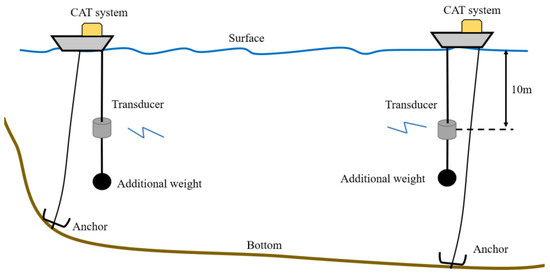 Experimental settings: two boat are fixed with an anchor, transducers are installed 10 m under the surface with additional weight, and CAT systems are synchronized with GPS.