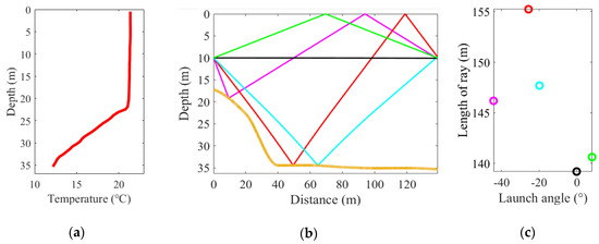 (a) Temperature profiling measured by CTD casts. (b) Ray simulation with five different ray paths. The yellow line represents the bottom terrain. (c) The launch angle of the rays and its corresponding lengths.