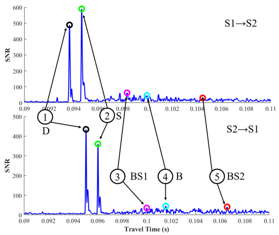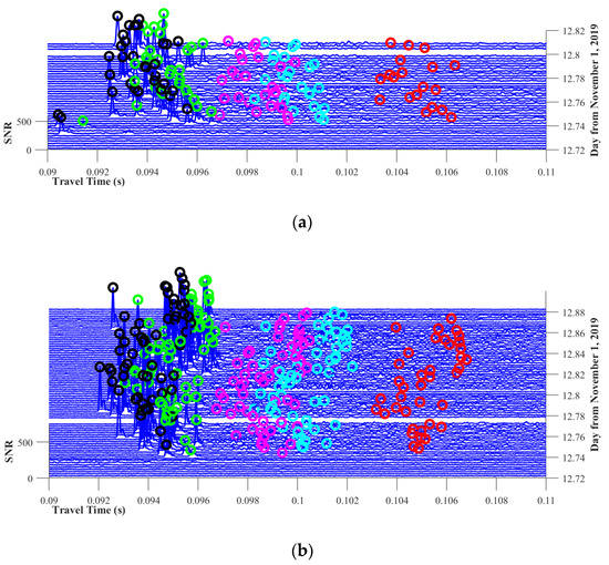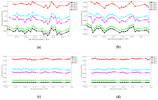 As shown in Figure 7, multi-arrival peaks are successfully identified using the method mentioned above. Unfortunately, station S1 missed some data after the experiment, which may be caused by incorrect operation of instruments. As a result, the number of signals in Figure 7a is smaller than in Figure 7b. In the inversion process, reciprocal transmission data are required to calculate , thus, some data from Figure 7b are not used. Moreover, it is clear that the travel time fluctuates significantly during the experiments.