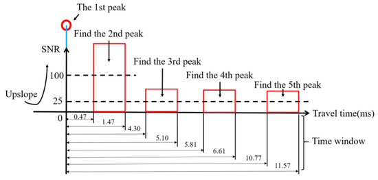 The correlation results of one sampled transmit–receive process are displayed in Figure 5. The five-colored circle marks the peaks of the corresponding arrival sound rays. As shown in Figure 5, the first and second peaks are significantly larger than the others, and it shows a great loss after bottom reflection. The first peak is not necessary the largest peak, thus, the upslope-point method, which uses a predetermined SNR threshold to find the first peak instead of the largest peak, is used during the arrival peak identification. The multi-arrival peaks are identified using time windows calculated by the reference travel time of each ray. The time windows are listed in Table 3. Note that every time window takes the first peak as the reference beginning instead of the prior peak. This is because the SNRs of the last three peaks are too small, which may be identified unsuccessfully during the identification process. The method to identify multi-arrival peaks is diagramed in Figure 6.