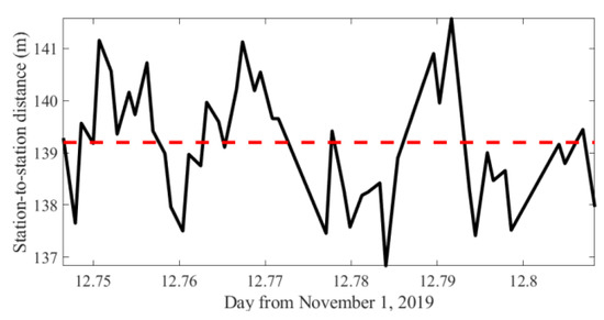 According to the analysis in Section 3.1, irregular fluctuations of travel time can be observed in Figure 7. The fluctuations are a result from slight position drifting of the moored ships. Although the drifting may cause great errors, it can hardly be avoided, as transducers are hanging in water and are affected by turbulence and floating of the fishing boat. From Figure 4a,b, we can observe that the direct path can be regarded as a straight line which travels through the first layer that almost has no temperature variation, thus, the travel time of the direct path can accurately estimate the station-to-station distance. Using the first arrival time, the real-time station-to-station distance can be calculated, which is shown in Figure 8. It can be seen that the distances have intense fluctuations during the experiments. The root mean square error (RMSD) of the distance reaches 1.11 m.