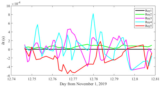 The travel time deviations are diagramed in Figure 10. The travel time of ray 1 is used to correct other travel times, thus showing no deviation in the figure. The deviations of ray 2 show only slight variations, which corresponds to high SNRs of the second peaks. However, deviations of ray 3, ray 4, ray 5 have relative larger fluctuations, which also corresponds to the low SNRs of these peaks. The deviation fluctuations of the last three peaks are mainly caused by incorrect peak identifications. Different from the last three peaks, the SNR of the second peak is significantly larger, which is far less likely to be missed. As a result, slight variations in the second peak are assumed to result from the position drifting, which changes the ray path and is difficult to simulate.