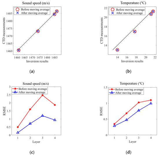 It can be seen that the RMSEs of the sound speed and temperature are greatly improved after the moving average, while the average values change slightly. Consequently, the moving average is suitable to eliminate the noise and, at the same time, has a relatively small influence on results. More visible results are diagramed in Figure 13 using data from Table 4.