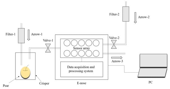 An electronic nose (E-nose), designed to mimic human olfactory perception and identify volatile gases, is a device which mainly contains three parts: a sampling system, a sensors array unit and a data acquisition and processing system []. The principle of E-nose is that the sensor array detects an odor composed of numerous different volatiles in a sample’s headspace and provides a “fingerprint” which is employed to mine potential information about samples based on appropriate algorithm []. E-nose devices play an important role in fruit quality detection due to their advantages of non-destructive analysis [] and portability []. Voss et al. [] obtained odor data from peaches using a metal oxide semiconductor (MOS) E-nose and designed a model to monitor the growth cycle of peaches using the Random Forest method, which achieved an accuracy of 98.08% on sample test step. Feng et al. [] proposed a method for evaluating the freshness of cherry tomatoes using a MOS-based E-nose and analyzing the data with an extreme learning machine (ELM) and the partial least-squares method, which proved that the combination of the E-nose and the ELM was reliable for evaluating the quality and freshness of cherry tomatoes during the cold storage. Chen et al. [] demonstrated that using an E-nose and headspace solid-phase micro-extraction combined with gas chromatography-mass spectrometry (HS-SPME/GC-MS) was a fast and accurate method to examine the volatilization of ten varieties of fresh jujube. To the best of our knowledge, most previous studies that utilized E-nose devices have focused on the identification of fruit ripeness, fruit freshness, and fruit flavor; however, few studies investigated the detection of brown core in the Chinese pear variety Huangguan using an E-nose.