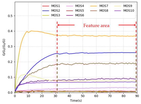 All the experiments were conducted in the author’s laboratory (temperature: 25 ± 1 °C, relative humidity: 50 ± 2%). Figure 1 presents the schematic diagram of the collection of odor information using the E-nose. Before using the E-nose to collect data, the pear was placed into a crisper (polypropylene, 150 mm × 150 mm × 180 mm) for 900 s to allow the volatile odor of the pears to fill the crisper. We used the 15 polypropylene crispers to place the sample pears in our experiments. The crisper was cleaned with air filtered by activated carbon after a pear was sampled and not be reused until the remaining 14 crispers were used. The E-nose operation consisted of the collection and cleaning stages. During the collection stage, air flows into the crisper in the direction of arrow-1 and flows out of the E-nose in the direction of arrow-3. During this stage, valve-1 is in the open state and valve-2 is in the closed state. The sample’s volatile gas was drawn into the E-nose at a constant flow rate of 10 mL/s and came into contact with the ten MOS sensors in the chamber. As the sensor surface became saturated, the conductivity increased, and the value stabilized. The collection stage lasted 90 s. During the cleaning stage, air filtered by activated carbon was drawn into the E-nose in the direction of arrow-2 to remove the substances adsorbed on the surface of the sensor. During this stage, valve-2 is in the open state and valve-1 is in the closed state. The cleaning stage also lasted 90 s to ensure that the material adsorbed on the surface of the sensor was removed entirely. The cleaning stage occurred after the completion of the collection stage. According to the characteristics of the MOS sensor, the response curve of the sensor increases rapidly initially and then flattens gradually in the collection stage. The stable value (SV) is a crucial and simpler feature parameter of the E-nose response signal, which can reflect the properties of substances in the volatile gas and be used in pattern recognition algorithms appropriately. We used the SV of the response signal as the input data of the neural network. Since the response signal of the PEN3 E-nose entered the stable state at 30 s, we used the data from 31 s to 90 s as the SVs. An example of the response curves of the E-nose for pears during 90 s of collecting stage was showed in Figure 2. Each curve represents the ratio of G (the conductivity of sensors contact with sample’s volatile gas) to G0 (the conductivity of sensors contact with air filtered by activated carbon) and the feature area was displayed between the two red dotted lines. Therefore, the data we obtained were expressed as a 14,400 × 10 matrix for training, and a 6120 × 10 matrix for testing (the sampling period of the E-nose was 1 s).