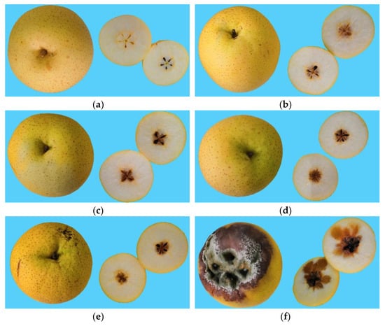 Photos of the Chinese pear (Huangguan) with different browning levels. Photos (a–f) indicates the levels of pear browning from class 0 to class 5, respectively.