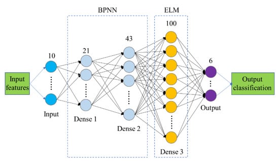It is well known that in traditional BPNNs, a large number of hidden layers result in excess features learned by the network, leading to overfitting of the network. However, if there are too few hidden layers, the performance of the BPNN could be affected. The ELM has better generalization performance than the BPNN [], but the structural characteristics of a single hidden layer may result in an inability of the network to extract sufficient features of the data.
