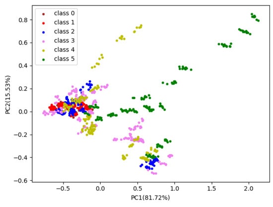 Principal component analysis (PCA) is a standard feature extraction method used in pattern recognition [] that minimizes the correlation between the components by rotating the covariance matrix []. We used PCA to extract the principal components of the training samples. The scatter diagram of the PCA result was showed in Figure 4, in which the dimensions were reduced from ten variables to two principal components. The contribution of the principal component 1 (PC1) was 81.72%, and that of principal component 2 (PC2) was 15.53%. In general, the first few principal components whose cumulative contribution exceeds 95% are considered to contain nearly all the information of the original data []. Therefore, we believe that PC1 and PC2 are representative of the characteristics of the original data. We selected randomly 18 pears (3 × 6, three pears per category from the training set) to present the PCA results as an example in Figure 5. As shown in Figure 5, the odor information of the six categories of pears has significant overlap, and the categories cannot be visually distinguished in the two-dimensional projection space based on PCA. Accordingly, we concluded that the odor of pears with different levels of browning was rich and strong. Even if the cumulative contribution rate of PC1 and PC2 reaches 97.25%, it was still not easy to distinguish pears with different levels of browning in a low-dimensional space.