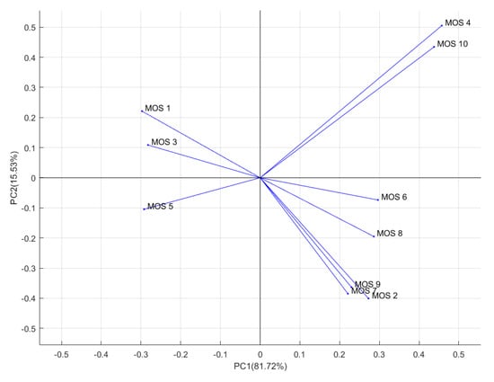 The PCA loading plot was shown in Figure 6. Ten vectors represented ten sensors (MOS 1, …, MOS 10) of the PEN3 E-nose. The contribution of sensors is denoted through the direction and length of vector. As shown in Figure 6, MOS 4 has the largest positive coefficient for first principal component so that MOS 4 has the largest contribution to the first principal component during the process of PCA.