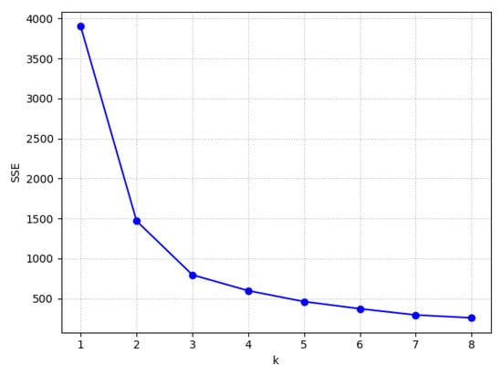 where is the ith cluster, d is a sample of , is the mean of all samples of , k is the number of cluster center. Figure 7 shows the relation curve between the SSE and k; a value of k = 3 was used because the rate of decrease of the SSE was relatively low when k > 3. The width of the activation function was obtained using Equation (11):