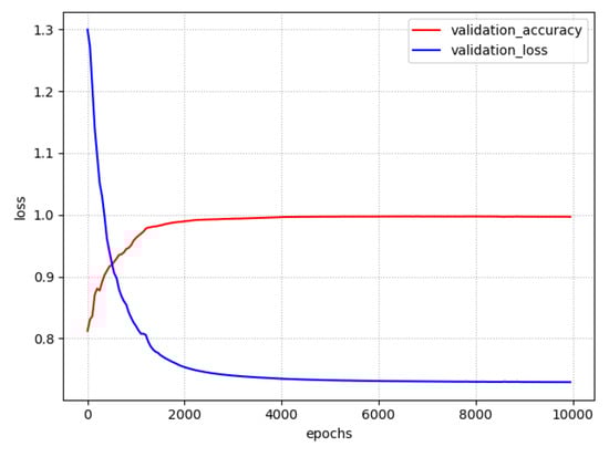 For training the BP-ELMNN, 10-fold cross-validation was used to evaluate the performance of the network on NTR. The curves of validation loss and accuracy during training process are shown in Figure 8. After 8000 epochs, the validation loss did not decrease further, and the accuracy for the NTR was 0.9874, indicating convergence. As shown in Table 5, the BP-ELMNN achieved the highest classification accuracy for the NTE, with an accuracy of 0.9683, macro-precision of 0.9688, macro-recall of 0.9683, and a macro-F1 score of 0.9685.