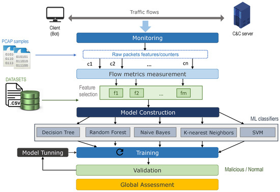 The analysis of traffic-flow patterns targeted on observing, understanding and characterizing the behavior of botnets at the network level is the object of study in this research. To illustrate the communication scheme and the performed analysis of such network traffic-flow patterns, Figure 1 depicts the client-server architecture where botnet traffic is exchanged from the compromised machine (bot) to the Command and Control (C&C) server. It is to note that regardless of the number of machine learning methods considered in this proposal, they can be easily extended to further algorithms as our methodology remains generic. Grounded on the botnet analysis conducted on similar proposals [22,23,24], and to address the proper characterization of this variant of malware, five processing stages have been defined—collecting network traffic samples (benign and malicious), flow metrics measurement, implementation of machine learning models, training, validation and prediction assessment. They are explained in the following subsections.
