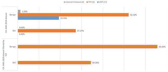 To get a general idea of the CIC-AWS-2018 distribution, a bar chart was plotted for each feature in contrast to the class attribute as shown in Figure 2. It can be noticed a concentration of botnet samples with 27.27% for the TCP (Transmission Control Protocol) protocol. The destination ports associated with this protocol are 8080 and ephemeral ports, a range of TCP ports that require a number of auxiliary ports to communicate with other machines [43]. Because the number of benign samples is highly concentrated on TCP traffic, the entire dataset was filtered by TCP. Hence, the portion of botnet samples has risen to 34.35%.