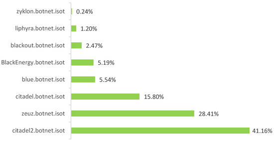 When the ISOT HTTP Botnet dataset was analyzed, it was found that the majority of flows were transmitted using the UDP protocol (17). Additionally, a comparative analysis between botnet types was carried out to find out the concentration of them across the dataset. The result of this analysis is shown in Figure 3, where it can be seen that the Citadel botnet represents the highest percentage of samples (41.16%) and the Zyklon botnet presents the lowest proportion (0.24%) of the dataset.