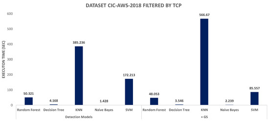 The CIC-AWS-2018 test dataset was evaluated with the following supervised learning classifiers—Random Forest, Decision Tree, Naive Bayes Gaussian, Support Vector Machine (SVM) and K-nearest neighbours. After analyzing the original CIC-AWS-2018 dataset, it was found that the Random Forest model turned out to be the most appropriate to correctly predict a botnet with 99.998% of precision over the rest of the models with a slight difference, with the exception of the Naive Bayes model (43.831% of precision). However, in spite of the average accuracy exceeding 94%, the results are biased, so it was necessary to balance the data. For this reason, the CIC-AWS-2018 dataset was filtered by TCP, being the predominant transport protocol as it is shown in Figure 2, where most botnets are grouped. Table 3 and Table 4 show the higher precision obtained by filtering the CIC-AWS-2018. It is to note that the detection accuracy broadly increases after implementing the Grid Search algorithm in each of the evaluated models. Based on these results, it is seen that Naïve Bayes obtains the lowest performance compared to other classifiers.