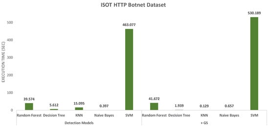 Alenazi et al. [26] proposed a novel detection framework designed for detecting HTTP botnet attacks. Three models are designed with this objective in mind. Firstly, the Domain Mass Detector analyzes features of DNS queries, such as the total number of queries or the number of geo locations of resolved IP addresses, associated with malicious fast flux DNS servers to recognize botnet patterns. Secondly, the Application Detector profiles host applications by scrutinizing DNS traffic requests originated by legitimate applications to be compared with suspicious profiles based on domain features such as the FQDN length, query type, among others. In addition, the Time Series Detector examines possible timing behavioral patterns of HTTP bots where scheduled communications between the C&C server and the bot have been found by analyzing inter-queries intervals. Based on this criterion, the three models carried out the detection of HTTP botnets by comparing three classifiers—Gaussian Naive Bayes, Random Forest and Decision Tree. The ISOT HTTP Botnet Dataset was used for validation, which in turn contains following HTTP botnet specimens—Blackout, Zeus, Blue, Black Energy, Zyklon, Citadel, Liphyra and Betabot. The obtained results confirmed that the Naive Bayes Gaussian model has a low performance compared to the Random Forest and Decision Tree models. On average, the Random Forest model scored above 99%, except for the Application Detector with 94.8%. The same pattern was observed for Decision Tree, whose accuracy was higher than 99%, but 95.5% when computed for the Application Detector.