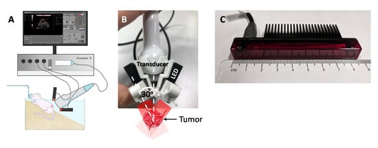 An AcousticX system integrated with a 7 MHz US transducer (128 elements, −6 dB bandwidth is 80%) and two 850 nm LED arrays (for deeper light penetration) attached on either side of the transducer at a 30° angle was used for in vivo imaging (Figure 1A–C). The mean lateral and axial resolutions of AcousticX when using a 7 MHz transducer are 460 and 220 µm, respectively [,]. Each LED array had height, length and width dimensions of 12.4, 86.5, and 10.2 mm, respectively, and had 144 individual LEDs arranged in 4 rows (36 elements/row). The PRF of the LED array could be varied between 1, 2, 3, and 4 kHz. In this study, we operated the LED arrays at a PRF of 4 kHz to acquire and save PA images of the tumor vasculature at a frame rate of approximately 10 Hz i.e., 384 PA frames were continuously averaged to generate one display image. For offline MATLAB analysis, a higher number of frames (12,800) was averaged to enhance the PA image SNR. The SNR was defined as SNR = S/σ, where S is the mean of the image amplitude in a signal region, and σ is the standard deviation of the image amplitude in a noise region. The signal region was empirically chosen as a rectangular region (4 by 4 pixels) near a feeding blood vessel on the tumor surface where the PA signal was apparent; the noise region was manually chosen to correspond to a rectangular region outside the tumor region.