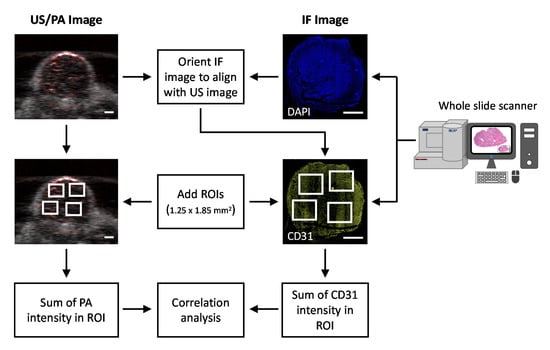 Flowchart describing the image processing methodology to correlate CD31 signal intensity with PA signals. (Scale bar = 2 mm).