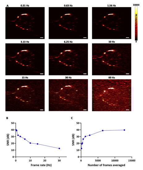 The signal-to-noise ratio (SNR) is enhanced by averaging several frames in the LED-based PA imaging system. (A) PA images of a tumor acquired and processed at different frame rates. (B) Relationship between the frame rate and SNR. (C) Plot detailing the SNR change with respect to the averaging of frames. (Scale bar = 2 mm).