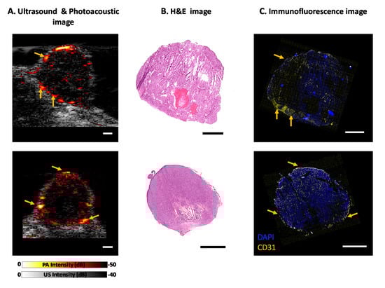Figure 4A shows the overlay of the US image (in grayscale) with the PA image of two representative tumors (offline reconstructed). The B-mode US image depicts the shape and structure of the tumor (~6 to 10 mm in diameter and depth), and the PA image provides the blood vessels location inside and around the tumor. The PA image is displayed on a pseudo-colored hot map where low and high signals are represented by black and white, respectively. Subcutaneous tumors are fed by large blood vessels usually originating from the skin tissue above or the muscle tissue lying beneath the tumor, as visualized in Figure 4A. AcousticX can detect the PA signal not only from the surface of the tumor but also from the deep edge (~10 mm) of the tumor. The Hematoxylin and Eosin (H&E) stain is a standard histology stain to showcase tissue microanatomy. Figure 4B showcases the H&E image of the tumor at the same cross-section as the US/PA image where the tumor structure is analogous to the shape and size observed in the US image. Figure 4C shows the IF image of the tumor cross-section with CD31 stain for blood vessels (yellow) and DAPI for cell nuclei (blue). DAPI staining was performed to visualize the tumor structure and aided in selecting corresponding ROIs as the US/PA image. Qualitatively we noticed regions of the high PA signal have high vessel density on the IF images as displayed by the yellow arrows in Figure 4. The blood vessels on the top of the tumor (particularly Figure 4A top panel) are not strongly visualized in the IF image as these vessels were part of the skin above the tumors which was removed during the histological processing of the tissue.