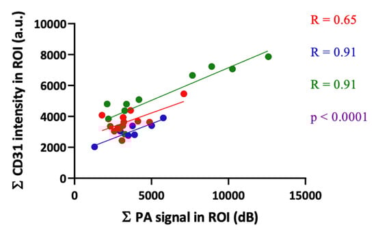 Correlation between background subtracted signal intensity from PA images and CD31 immunofluorescence (IF) image. Each color represents data from different mice. A total of 30 ROIs from three mice were used in our analysis. The R-value for correlation based on Pearson’s coefficient was calculated between the CD31 intensity from the IF image and PA signals from blood vessels.