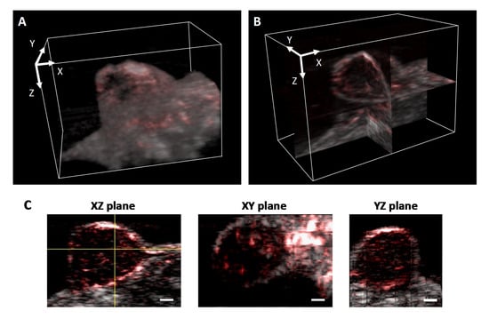 (A) Overlay of ultrasound and photoacoustic images of tumors reconstructed in 3D (Video 2) and (B) in orthoslice view. (C) Tumor images displayed in different 2D planes. (Scale bar = 2 mm, Video S2, MOV, 779 kB).