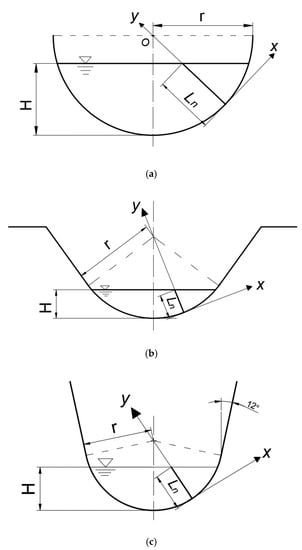 Three common kinds of cross-section types of channels with an arc-bottom. (a) Semicircle; (b) arc-bottom trapezium; (c) u-shaped. Here, x and y are the axes of the coordinate system, H is water depth, r is radius of the arc, and Ln is the length of the underwater part of the line.
