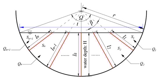 Since we have obtained the location formulation of characteristic sensing point of the flow-velocity sensor in Section 2.1, we can estimate discharge with multiple characteristic sensing points’ velocities through setting numerous measuring lines. As is shown in Figure 3, there are totally n measuring lines equally divided angle Ω, the length of which are l1, l2…ln. The angle between each two lines is β. It can be shown that