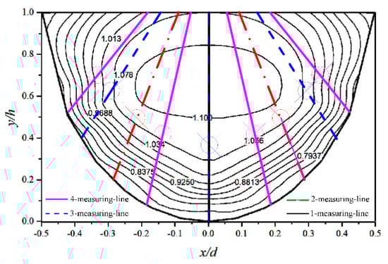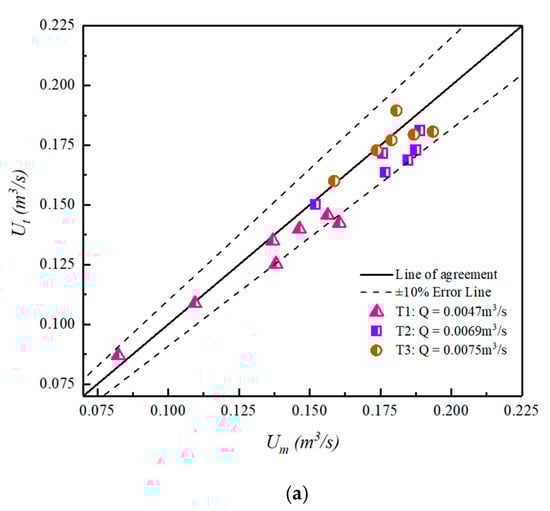 As can be seen from the above, the calculation formula of discharge has been given in Section 2.2. As is shown in Figure 7, for C2 experimental condition, we set four combinations of measuring lines.