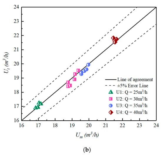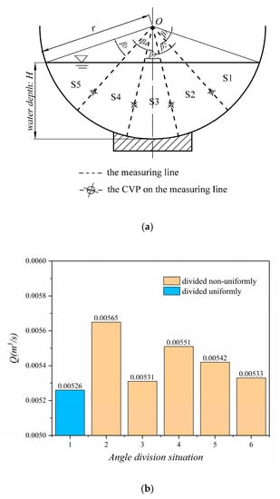 Then, the analysis is based on fixing the number of measuring lines and change the angle β between them. We take the C1 condition as the example. As is shown in Figure 8a, there are four measuring lines and the angles are randomly divided. Since Q = 0.005 m3/s in C1, Figure 8b shows that only the angle is divided uniformly, the calculated discharge is closest to the actual discharge.