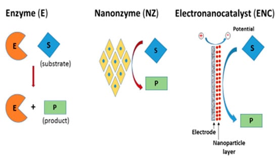 In many cases, the term “NZ” or “enzyme-mimicking activity” is used without a sufficiently strong reason. On our opinion, these terms can be used properly only for materials whose enzyme-mimicking activity has been proven in solution. In most papers, the catalytic activity was revealed only after applying a potential to an electrode modified by the tested nanocomposite. In this case, the catalytic nanomaterial should be named an “electrocatalyst” (“electronanocatalyst”), but not, strictly speaking, a “nanozyme” or “enzyme mimic” (Figure 1). We therefore propose naming a catalytic nanomaterial as a “NZ” (nanooxidase, nanoperoxidase, nanocatalase, nanolaccase, and so on) only when the nanomaterial exhibits the enzyme-like catalytic activity in solution/suspension, without applying an electrochemical potential.