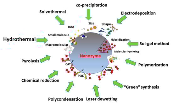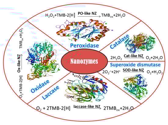 Nanozymes (NZs) are the newest class of functional nanomaterials [,,,] that have enzyme-like activity. They possess increased stability and greater availability due to their simpler preparation technologies. Described nanoscale materials include catalysts with different reaction specificities. They are mainly oxidoreductases: peroxidase [], haloperoxidase, catalase, glucose oxidase, sulfite oxidase, superoxide dismutase (SOD), laccase, monoxygenase, CO oxidase, ferritin ferrooxidase [], different hydrolases (phosphatase, phosphotriesterase, chymotrypsin, carbonic anhydrase), as well as proteases, endonucleases, DNA-ases, NO synthases, etc. [,,].