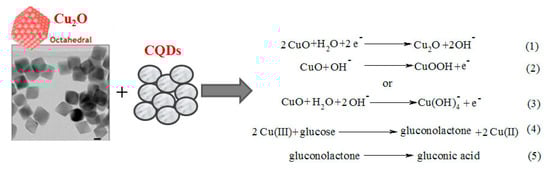In another example, it was shown that octahedral cuprous oxide (Cu2O) in combination with carbon quantum dots (CQDs) could be an efficient electrocatalyst for the detection of glucose [], The CQDs/octahedral Cu2O showed higher electrocatalysis for glucose oxidation and H2O2 reduction than the octahedral Cu2O. The cyclic voltammograms showed an oxidation peak at +0.6 V reflecting the conversion of Cu(II) to Cu(III) and showing high electrocatalytic ability for oxidation of glucose by the CQDs/octahedral Cu2O []. Equations (1)–(5) of the electrocatalytic oxidation reaction are presented in Figure 3.