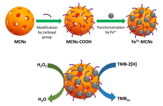 Schematic representation of the synthesis of Fe3+-decorated mesoporous carbon nanospheres (Fe3+-MCNs) and their peroxidase-mimicking catalytic activity [] (modified).