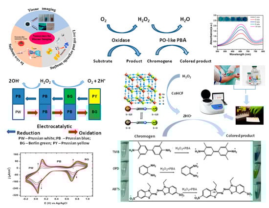 The term “nanozyme” was defined by Wei and Wang in 2013 [], although the first exciting discovery of Fe3O4-based ferromagnetic nanoparticles (NPs) with peroxidase(PO)-like catalytic activity was made in 2007 by Gao [], as cited by Huang []. In our opinion, Prussian Blue is another nanomaterial candidate for which catalytic activity toward hydrogen peroxide was proven for the first time (see, for example, a review by Karyakin in 2001 []).